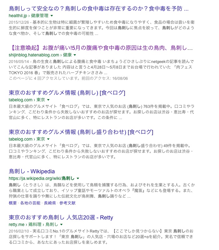 普通に考えると「鳥刺し」って検索すれば「おすすめの鳥刺し」とか「地元の特選品 ○○の鳥刺し 」「おすすめの鳥刺しのお店は」などの美味しい鳥刺しについて書いている記事やサイトが上に来るのではと思っていたのですが今「鳥刺し」と検索して見ると